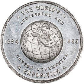 Obv. World globe in center, to l. 1884, to r. 1885; above globe * The World's * / Industrial and; below globe Cotton Centennial / * Exposition *; beaded border.