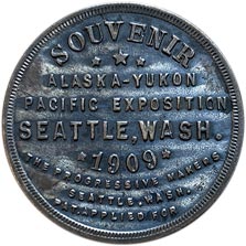 Obv. Souvenir / * * * / Alaska-Yukon / Pacific Exposition / Seattle, Wash. / * 1909 *; below, in small letters The Progressive Makers / Seattle. Wash. / Pat. Applied for; beaded border.