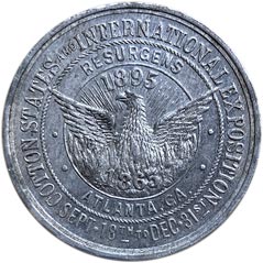 Obv. In center, phoenix, wings outstretched, rises from flames; rays and 1895 above, 1865 in flames below; microscopic Childs below l. and Chi below r. of date--all within circle; within outer rope-like circle and inner circle, at top Resurgens, at bottom Atlanta, Ga., two dots on each side between; wing tips of phoenix extend through second circle; border legend Cotton States and International Exposition Sept 18th to Dec. 31st