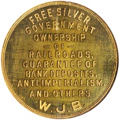 Rev. In 11 lines, Free Silver / Government / Ownership / --of-- / Railroads, / Guarantees of / Bank Deposits, / Anti-Imperialism, / and Others / W J. B.; beaded border.