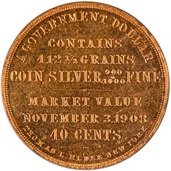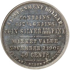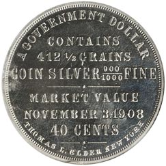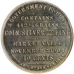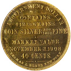 Obv. In eight lines, first and last curved, remainder straight, A Government Dollar / Contains 412 1/2 Grains / Coin Silver 900/1000 Fine / Market Value / November 3. 1908 / 40 Cents / Thomas L. Elder New York; beaded border.