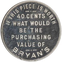 Rev. In seven lines, first and last curved, others straight, If This Piece is Worth / 40 Cents / What Would / be the / Purchasing / Value of / Bryan's; beaded border.