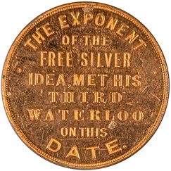 Rev. In seven lines, The Exponent / of the / Free Silver / Idea, Met His / Third / Waterloo / on This Date; beaded border.