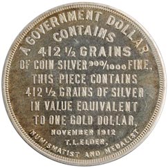 Obv. In 11 lines, first, second and last curved, others straight, A Government Dollar / Contains / 412 1/2 Grains / of Coin Silver 900/1000 Fine, / This Piece Contains / 412 1/2 Grains of Silver / in Value Equivalent / to One Gold Dollar, / November 1912 / T. L. Elder, / Numismatist and Medalist; beaded border.
