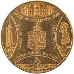 Rev. Shield in center; around border are four arcs of equal size; in upper arc is edifice; outside, below Iolani Palace Capitol Bldg.; in r. arc is female figure; outside arc Hula Girl; in l. arc is edifice; outside arc Aloha Tower; in lower arc is surf rider; outside, above Surf Riding Waikiki