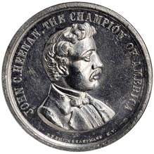 Obv. Raised male bust facing r.; above John C. Heenan, the Champion of America; below bust, microscopic F. B. Smith & Hartmann N. Y.