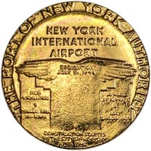 Obv. In center is an involved shield-like design; above New York / International / Airport; on shield, at top, small Dedication / July 31 1948; on l. panel of shield Size / 4900 Acres / Terminal Area / 160 Acres; on r. panel of shield 10 Miles / of Runways / Cost / $160,000,000; below Construction Started / by the City of New York / April 1942; border legend The Port of New York Authority