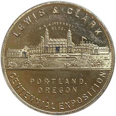 Comment: Preliminary was construction of Lewis and Clark monument, Washington Park, Portland; President Roosevelt laid cornerstone May, 1903. State emphasis was on Fisheries, Forestry and Mining but seven major exhibition "palaces" offered usual national exposition fare. Last surviving building, Forestry building ("World's largest log cabin"), was used during Oregon Centennial Exposition 1959 but destroyed by fire on Aug. 17, 1964. Late Farran Zerbe supervised numismatic display that was "greatest...ever at any exposition"; also directed sale of Lewis & Clark commemorative gold dollars, medals, etc.
