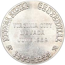 Medals: Official Medal authorized by 86th Congress, designed by Committee and struck at Philadelphia Mint from "silver furnished by Nevada..." Issue limited to 1,000 pieces; sold out for $5 "by midsummer 1959." Congressional designation as "national medal" permitted striking of additional number "upon approval of issuing Commission" but Centennial Committee officially advised on June 7, 1960 that no more would be struck.