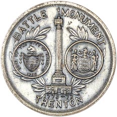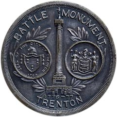 Rev. Monument, with Seal of City of Trenton to l. and another circular Seal to r., each Seal superimposed on a spray of leaves; above Battle Monument; below monument 1776-77 / Trenton; beaded border.