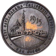 Obv. Exposition entrance, above to r. 1915-- all within beaded circle; outside, around West Gate, Panama-California-Exposition, below * San Diego *; beaded border.