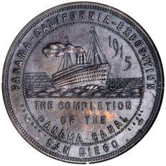 Rev. Ship passing thru Canal, to r. 1915, below The Completion / of the / Panama Canal--all within beaded circle; outside, above Panama-California-Exposition, below San Diego; to l., microscopic Casparv, to r. L. A. Cal.; beaded border.
