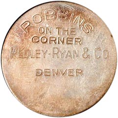 Obv. Robbins / on the / Corner / Pedley-Ryan & Co. / Denver. The word Robbins is curved; remaining lines, straight.