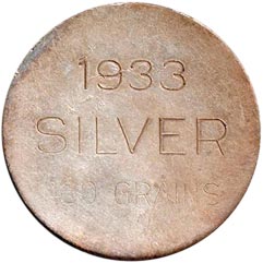 Only 15 issued, all on Jan. 6, 1933. This variety was withdrawn when it was discovered that an error, 90% instead of 99% Fine, had been made. The word Fine was chiseled out and the altered die was used to strike additional pieces (Type III) for the silver movement boosters present at the striking.