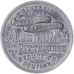 Obv. Across Souvenir / of the / on ribbons Pittsburgh / Exposition / no ribbons Aluminum small Made / small by / the large Pittsburgh / Reduction / Company (no beaded border)