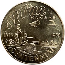 Obv. Central design depicts 2 pioneers and an Indian on bluff to l. overlooking city to r.; to l. is 1858, to r. 1958; in upper center is an airplane, below city is a covered wagon; above all Salina / Kansas; at bottom edge Centennial