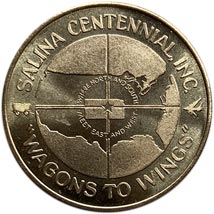 Rev. Relief map of U.S. with Kansas in center; 5-pointed star at location of Salina, crossroads N. and S., E. and W.; around outline of state, above Where North and South, below Meet East and West--all within center circle; at top, around Salina Centennial, Inc.; at l. edge is covered wagon, at r. edge an airplane; at bottom, around "Wagons to Wings"