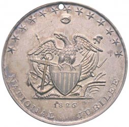 Medals, obviously commemorating 50th anniversary of Declaration of Independence, long have been prized possessions in American numismatics but research still fails to establish origin. Because of national importance of event, collectors and dealers alike recommended that exception be made here as to holed material and urged issue be listed.