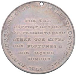 Rev. In 7 straight lines across, For the / support of this / we pledge to each / other our lives / our fortunes & / our sacred / honour; outside, around Declaration of Independence Signed July 4: 1776