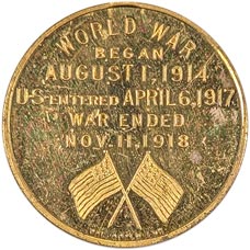 Rev. In 6 lines, first curved, others straight, World War / Began / August 1, 1914 / U.S. Entered April 6, 1917 / War Ended / Nov. 11, 1918; two crossed U.S. flags below; microscopic Pat. App'l'd for near edge at bottom.