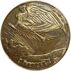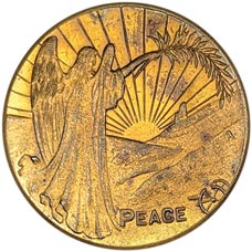 Obv. Winged figure of Peace, r., in outstretched r. hand, holds olive branch over battlefield and faces rising sun in background; small cannon to lower r.; near bottom edge, Peace.