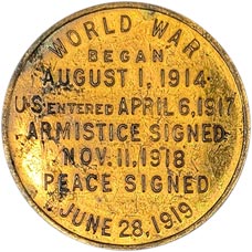 Rev. In 8 lines, first and last curved, others straight, World War / Began / August 1, 1914 / U.S. Entered April 6, 1917 / Armistice Signed / Nov. 11, 1918 / Peace Signed / June 28, 1919