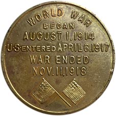 Rev. In 6 lines, first and last curved, others straight, World War / Began / August 1, 1914 / U.S. Entered April 6, 1917 / War Ended / Nov. 11, 1918; below, crossed U.S. flags.
