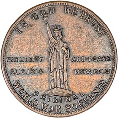 Obv. Statue of Liberty; to l., in field, For Liberty / Aug. 1914; to r., and Peace / Nov. 1918; legend above, In God We Trust; below statue Original / World War Souvenir.