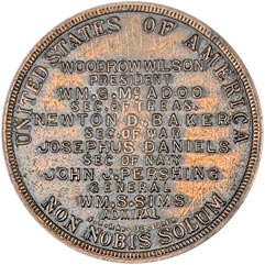 Rev. In 12 lines, center, Woodrow Wilson / President / Wm. G. McAdoo / Sec. of Treas. / Newton D. Baker / Sec. of War / Josephus Daniels / Sec of Navy / John J. Pershing / General / Wm. S. Sims / Admiral; Legend above, United States of America; below, Non Nobis Solum; Microscopic F.R. Haws Designer below Admiral.